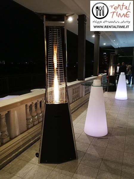 Fungo design a piramide per riscaldamento esterno. Superficie riscaldata 25-30 mq. (bombola GPL 25 kg esclusa). Made in Italy. Trasporto e montaggio a cura esclusiva del personale Rental Time.